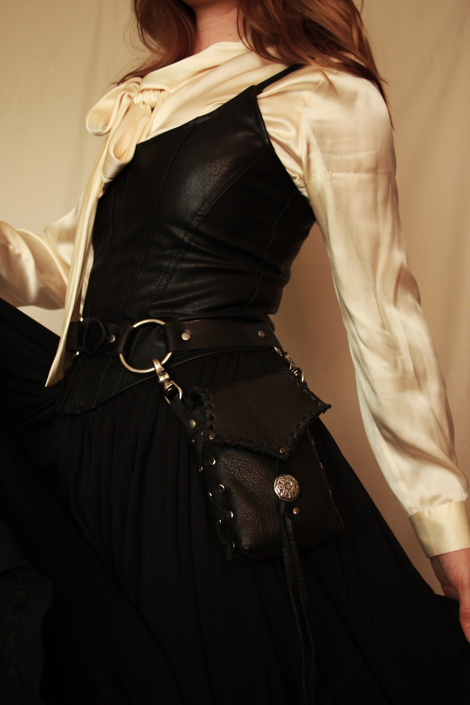 Step into the shadows of elegance with our Midnight Hip Bag, a beacon of sophistication amidst the revelry of the faire. Crafted from a soft black leather and adorned with antique silver accents, this accessory is a tribute to the mysteries of the night.