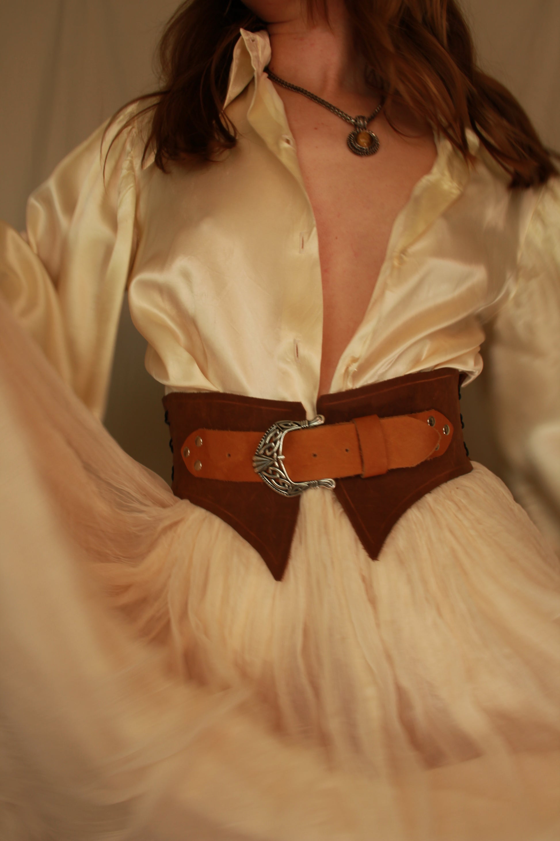 Step into a world of enchantment with the Sablethorn Corset Belt, a captivating blend of earth-brown leather and either brass or silver hardware. This accessory exudes timeless elegance, featuring a finely crafted buckle that pays homage to the creator's Celtic ancestry.